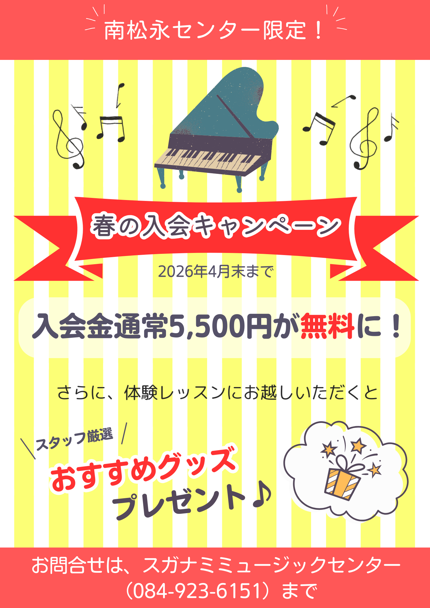 | お問合せ | TEL:084-923-6151 スガナミミュージックセンター Webでのお問い合わせ 詳しくは、スガナミミュージックセンターのHPをご覧ください。 |
