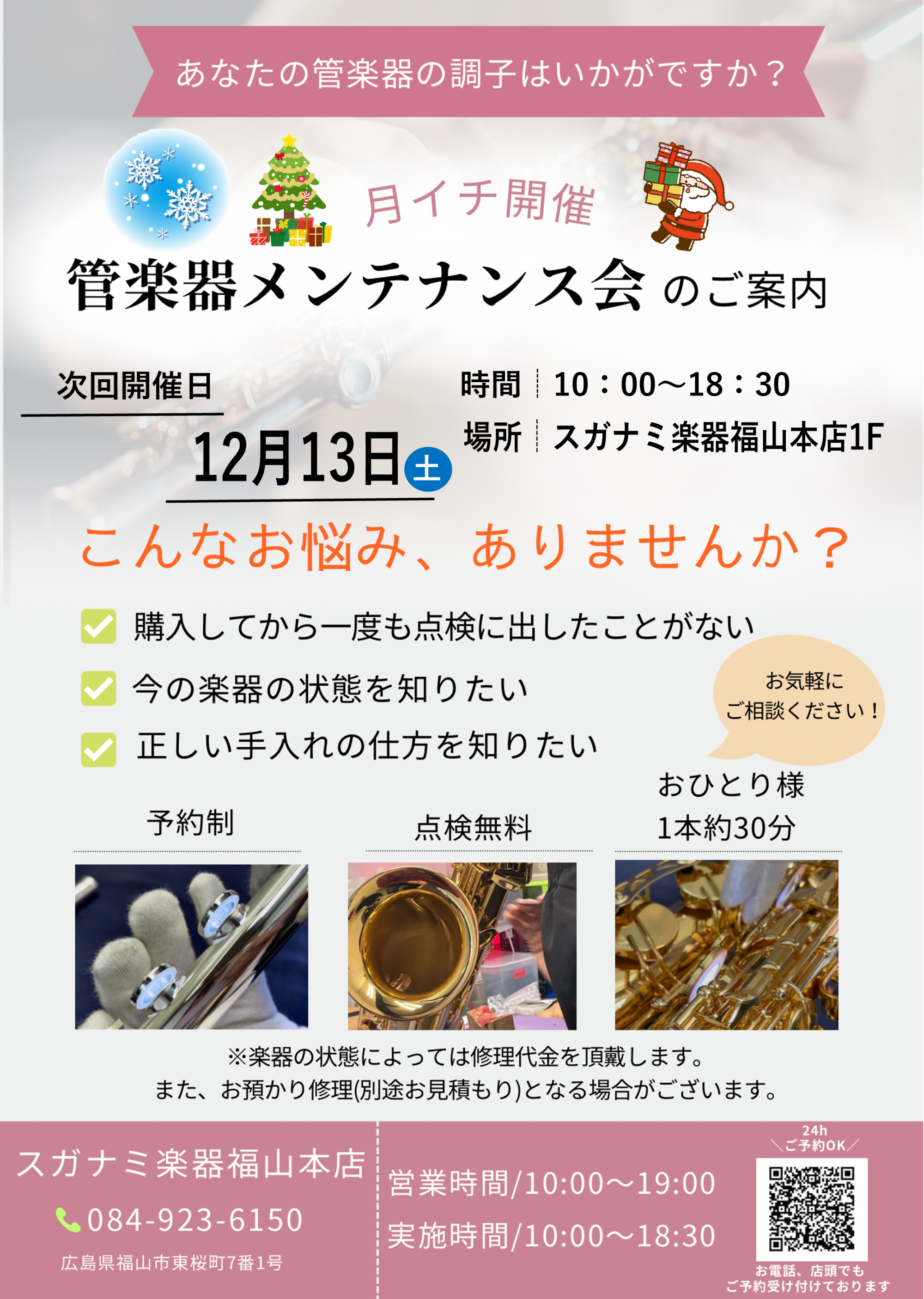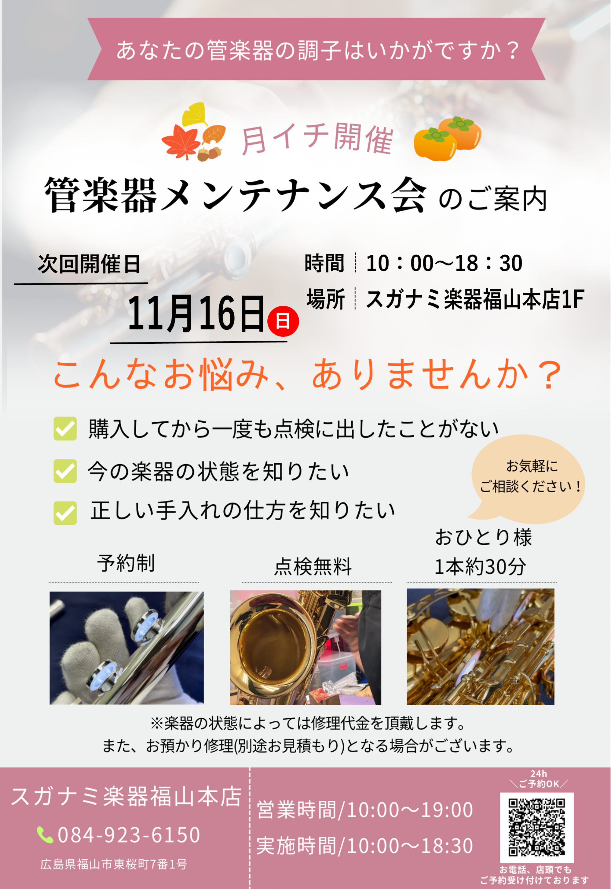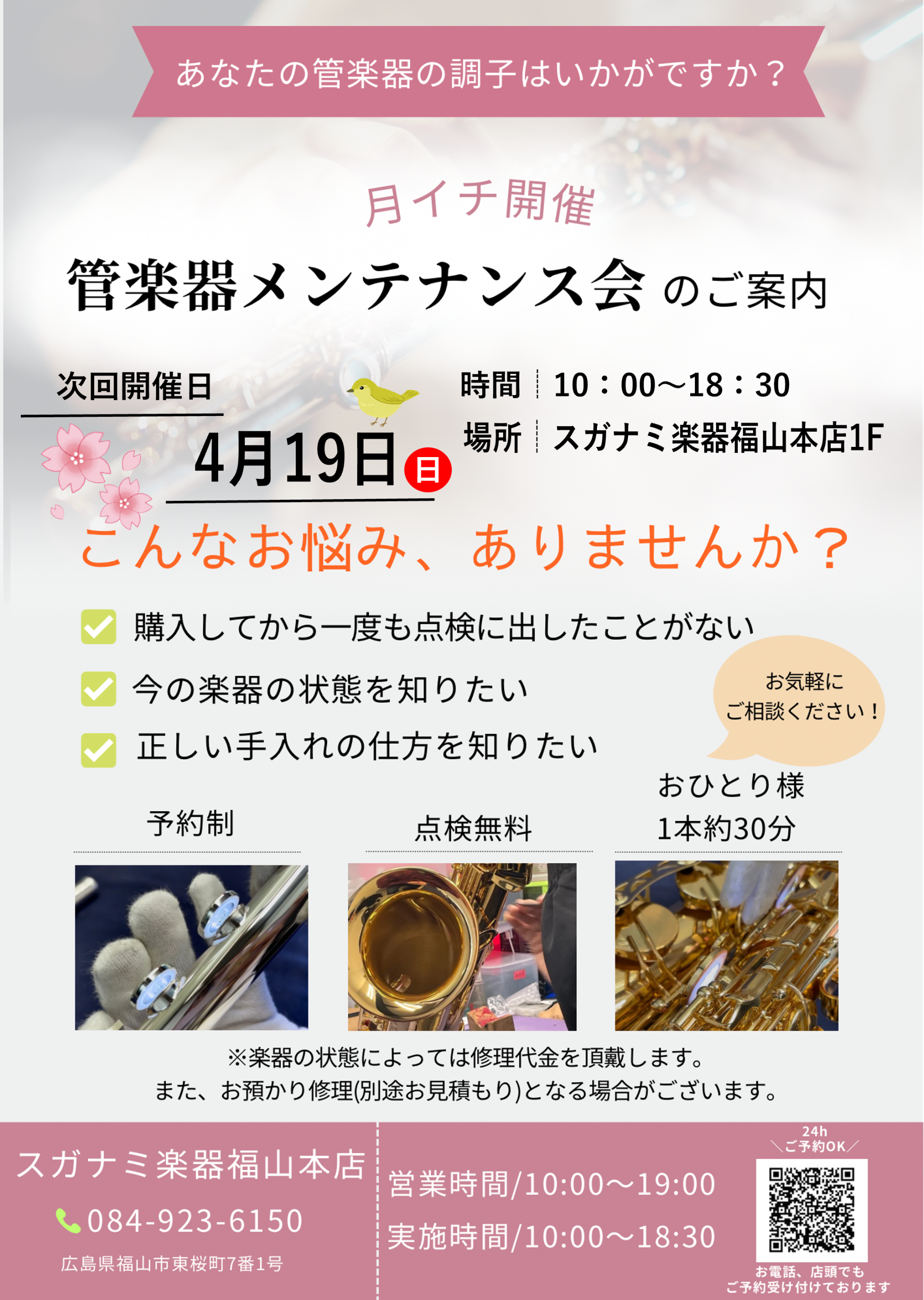 次回の管楽器メンテナンス会の空き状況・ご予約はコチラをClick↓