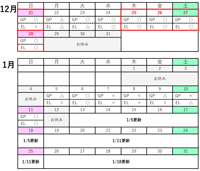曜日 | 時間 | 12月 | 1月 |